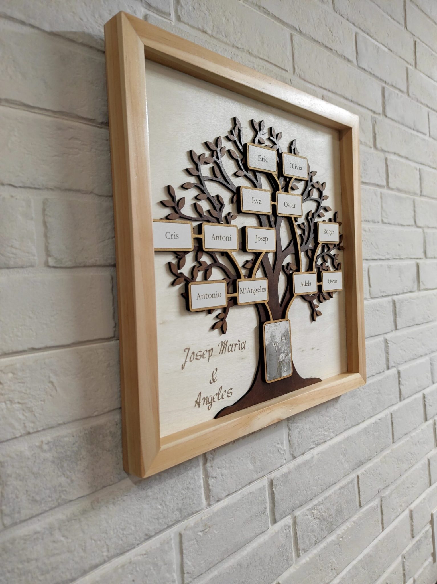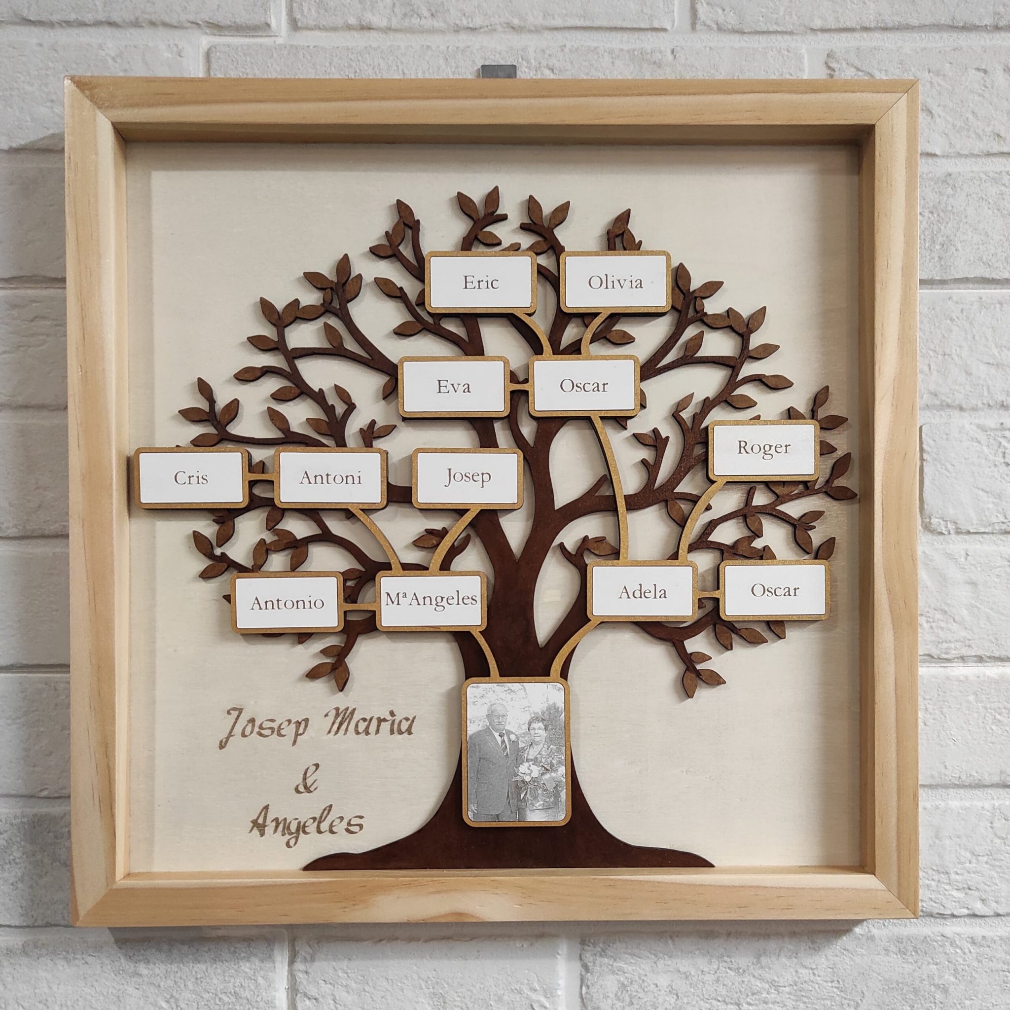 Cuadro de árbol genealógico cortado a laser con marco de madera natural, puede incluir una foto principal, el esquema que necesites y una dedicatoria grabada.